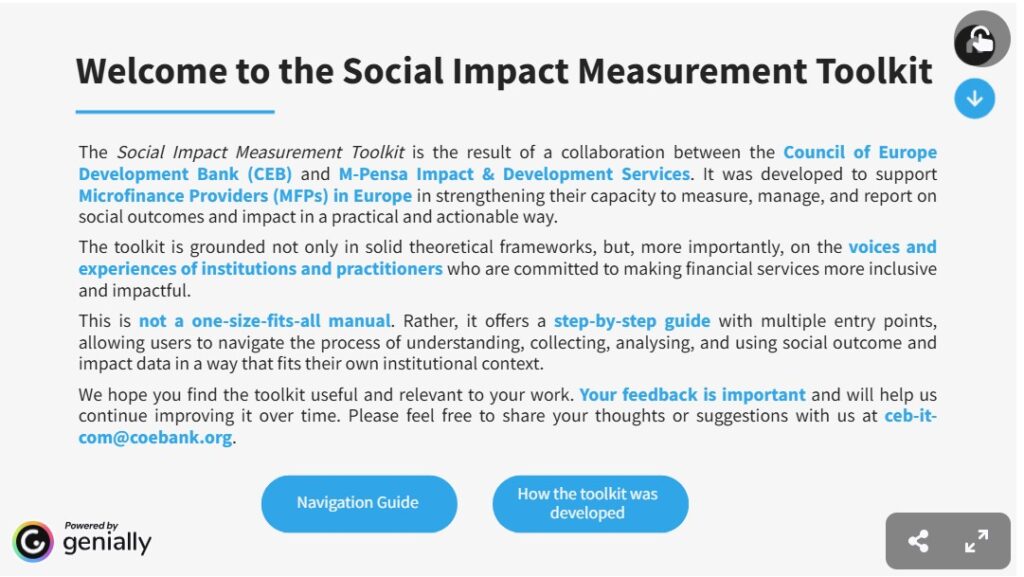 If you are a microfinance provider and are seeking to enhance the social impact of your work, then CEB’s new toolkit is for you. Created with InvestEU support, this interactive toolkit is designed to help you assess, plan and act with greater visibility and confidence. Try it now by hitting the Start button below. As well as instructions, insights, data and case studies, you will find contact information: your feedback to help us improve the toolkit would be very welcome.